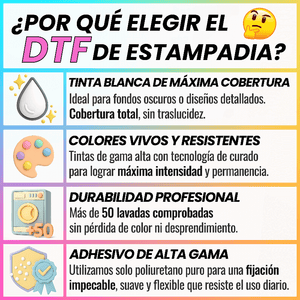 ⚠️ Para textiles 100% poliéster de colores oscuros o intensos, usa DTF ANTIMIGRACIÓN para evitar contaminación de color.