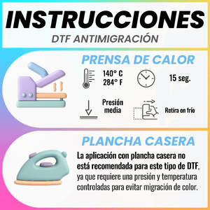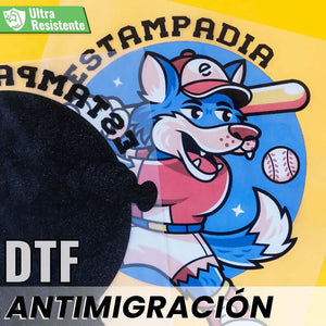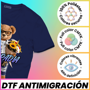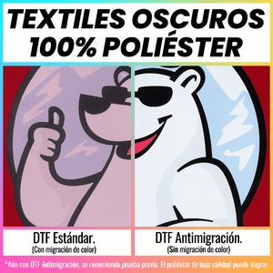 💡 Este DTF Antimigración adhiere a cualquier textil que soporte el tiempo y temperatura de aplicación, incluyendo poliéster oscuro y otros materiales sintéticos.